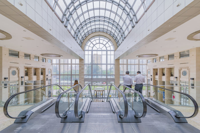 电 梯 — 大厦采用国际顶级品牌迅达700TM,高眉、高速、无齿轮超静宽体电梯。写字楼共设20部电梯, A、B两座各设8部客梯,分别服务于高低区,并特设2部尊士专用客梯,24小时运行。一层至三层设3部自动扶手电梯,直达写字楼大堂。上班时间2上1下,下班时间1上2下。